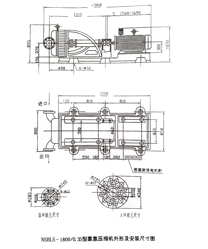 1.NSBLS系列氯气泵是倾斜式椭园形壳体,它是本厂专利产品(专利号:ZL93.2.300S63)。泵的规格不同,零部件通用性强:可直接使用 YLJ-750/0.3型氣气泵的基础、底座及进出口法兰安装尺寸,对于大规格气量 NSBLS-950/0.30型和 NSBLS-150/0.25 型的氯气泵,只有把原进口Φ 150mm 管道改为Ф 200mm管道,出口管道不变,电机仍配110KW。气量就由原来的 750m³/h 提高到 950m³/h或 1200m³/h。
