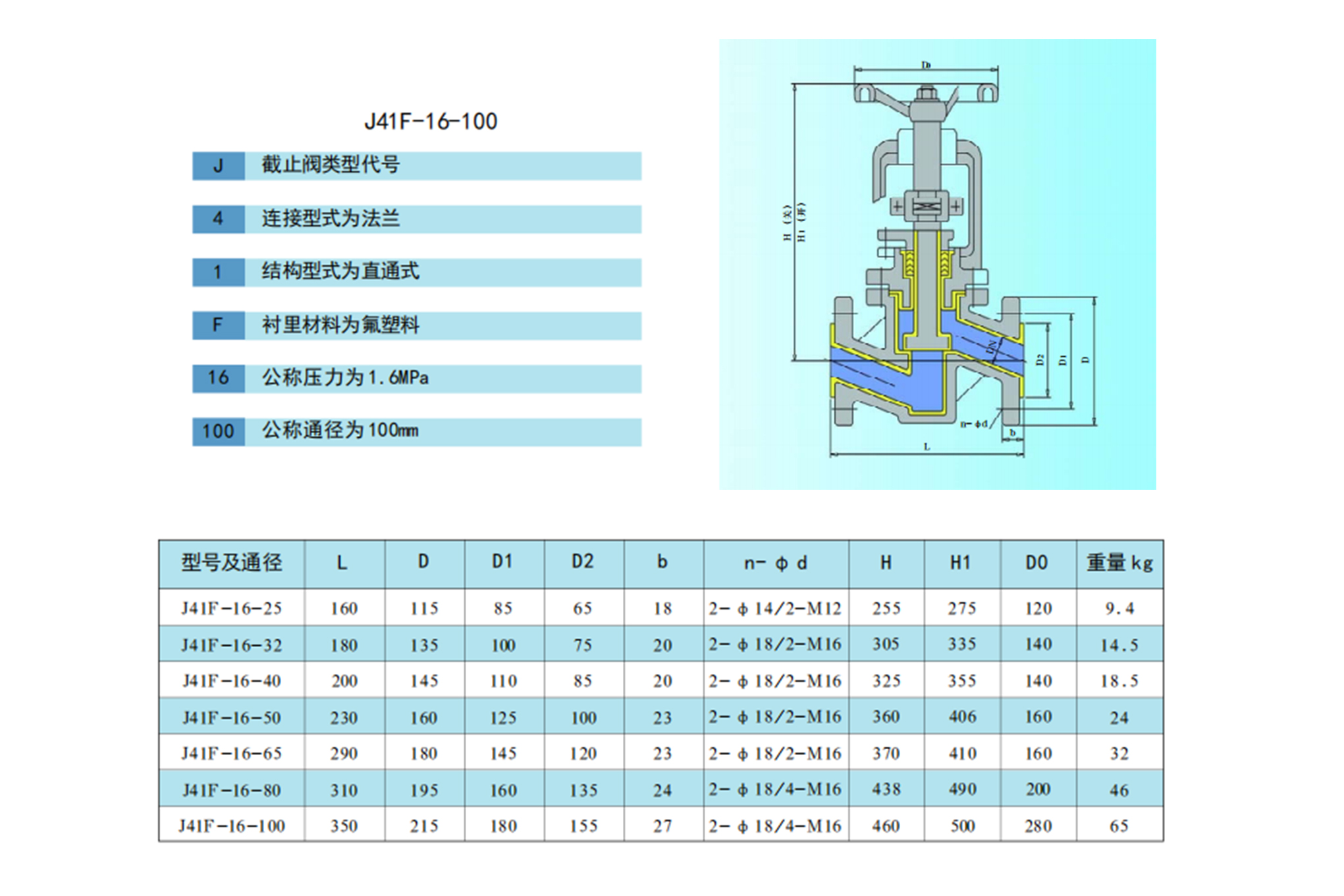 J41F-16 系列截止阀,阀体内腔及阀盖、阀杆等接触介质部分均衬有氟塑料合金,故具有最佳的耐腐蚀性能。