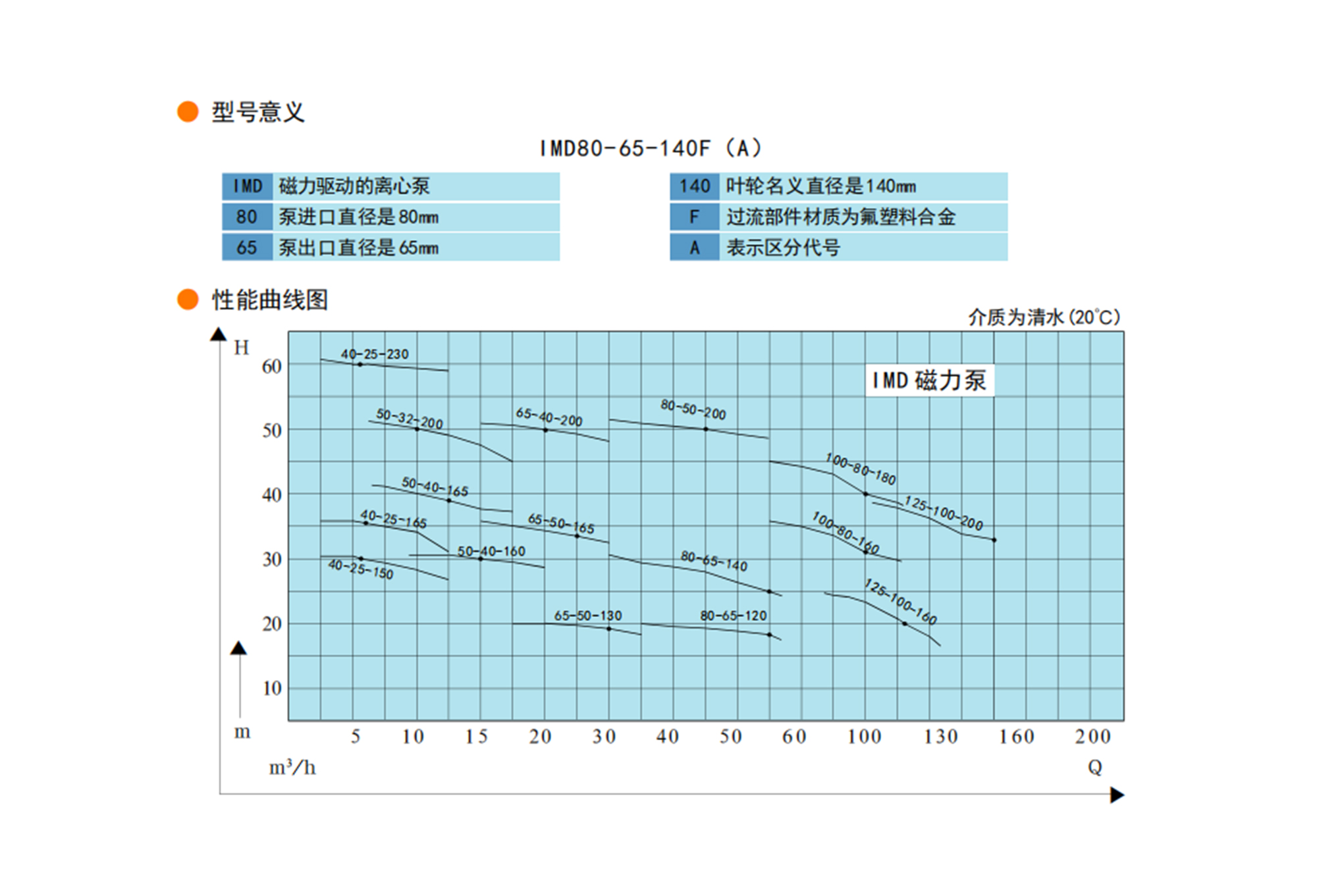 1.IMD系列磁力泵,流量:1~160m'/h;扬程17~62m,适用于输送强腐蚀,易燃,易爆,有毒,易挥发的化学介质。