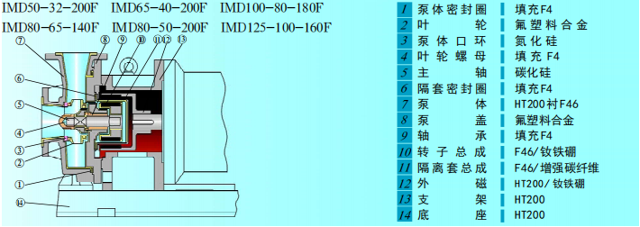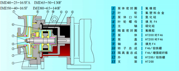 1.IMD 系列磁力驱动泵,取消了轴封,利用磁力偶合间接传动,完全消除了滴漏的现象。IMD系列磁力驱动泵采用最新材料制成的隔离套具有高强度的力学性能,彻底消除了一般磁力泵具有的磁涡流现象。